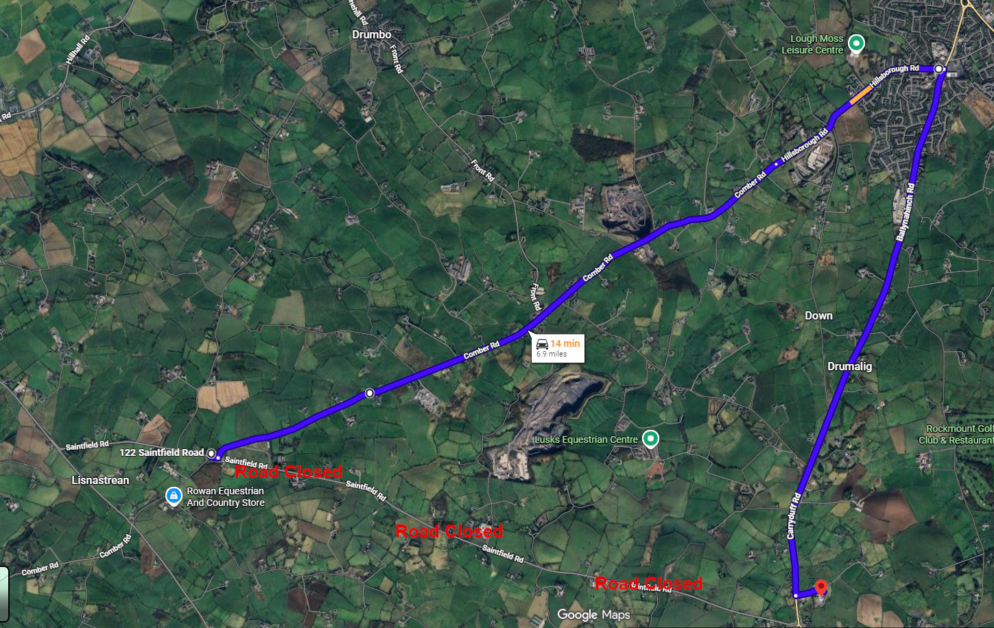 The Saintfield Road from Ballymacbrennan Crossroads to Temple Roundabout is closed from the 9th March - 20th March 2026 for resurfacing works.